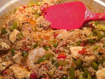 Jambalaya definition comes from the Provençal word ‘jambalaia’, meaning a mish mash, or mixup, and also meaning a pilaf (pilau) of rice. So basically anything goes.