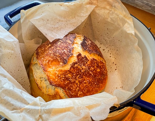 - Adjust oven rack to middle position. When dough is ready, place covered pot in preheated oven at 425 and back for 30 minutes.