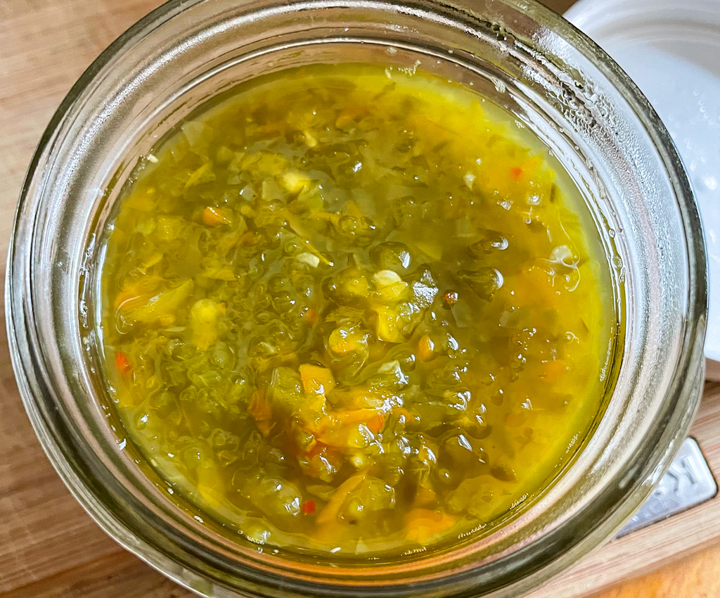 - Chop all peppers together. I used a food processor and pulsed it until it was very small chunks.
