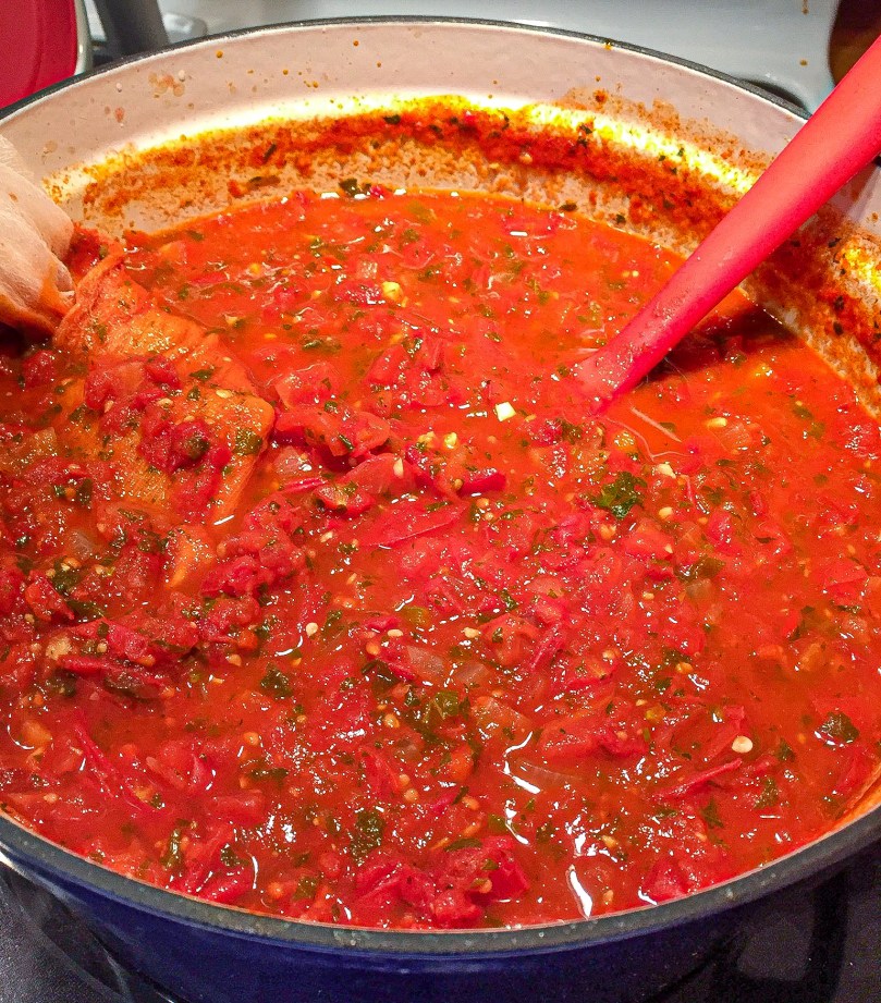 4. Add chopped tomatoes and bring to a boil. Once it boils, reduce heat to medium-low to simmer. Put the Parmesan rinds in a cheesecloth and put in the sauce. This is optional, I just find it adds a little something but if you don’t have any, the sauce is still good.